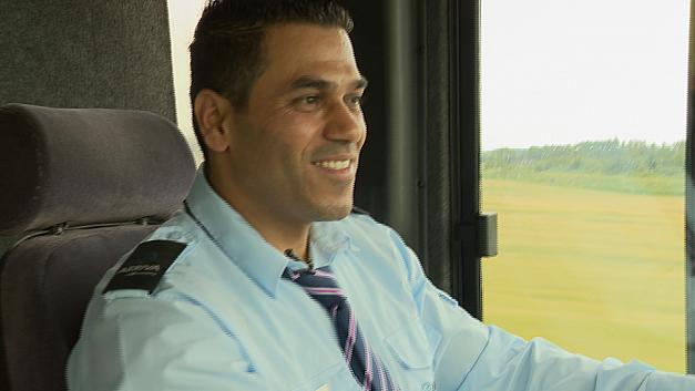 Det er ikke mere end tre år siden, at Feras Hussain Alkhatib flygtede fra Syrien til Danmark med sin familie. Kort efter at han bestod sin dansk-eksamen for nylig, fik han arbejde – som buschauffør hos Arriva. Det er han sgu glad for. God reklame for Arriva og Norddjurs Kommune.
