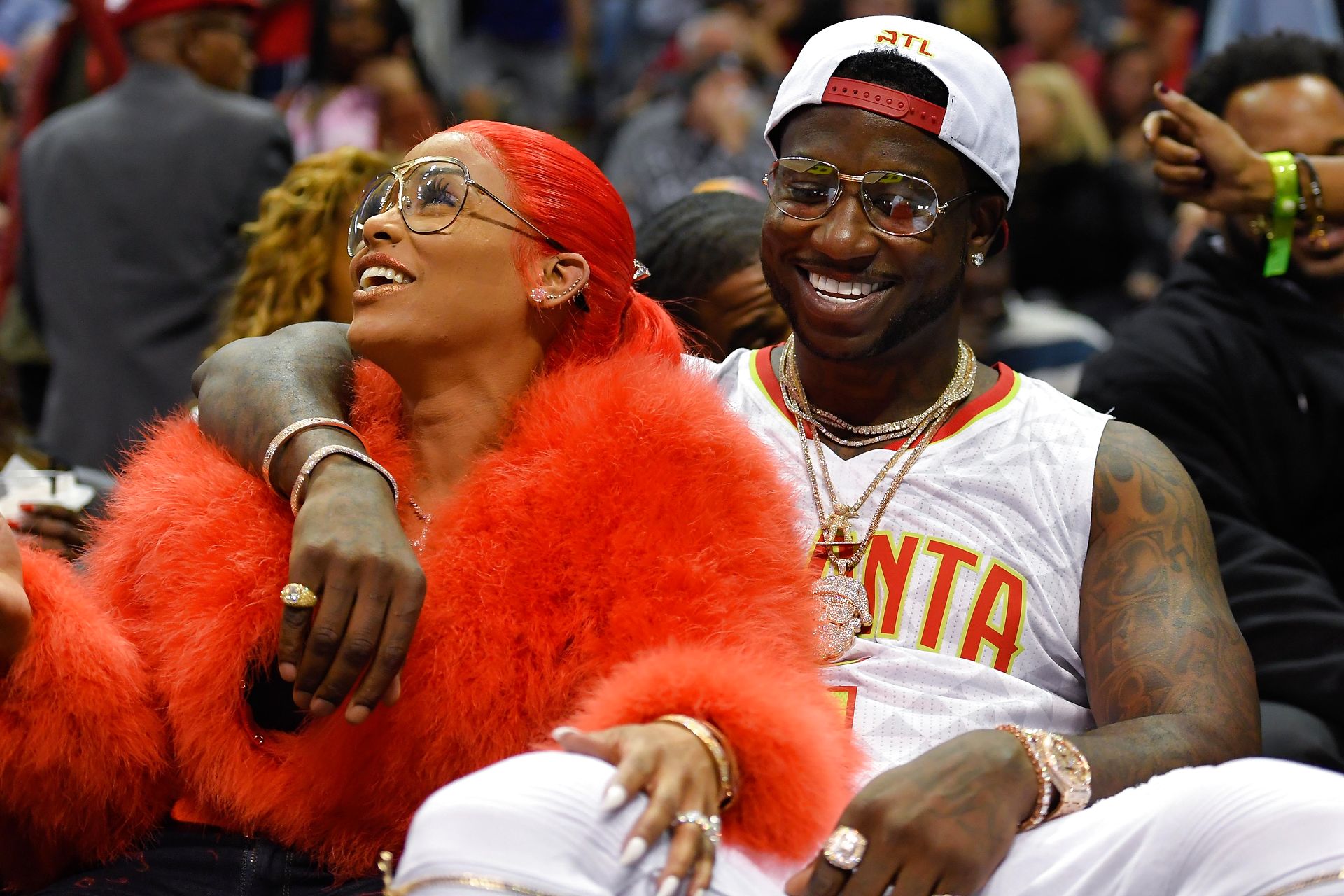 Nov 22, 2016; Atlanta, GA, USA; Recording artist Gucci Mane reacts with Keshia Kaoir after being engaged during a time out during the New Orleans Pelicans and Atlanta Hawks game during the second half at Philips Arena. The Pelicans defeated the Hawks 112-96.Mandatory Credit: Dale Zanine-USA TODAY Sports