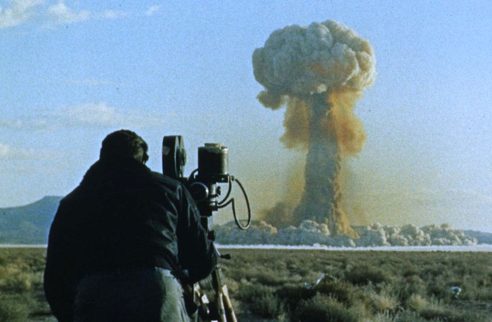 LOA01:ATOMIC:LOS ANGELES, CALIFORNIA, 22OCT97 - 1957 FILE PHOTO - A cinematographer films an atomic mushroom cloud in a project named "Operation Plumbbob" on July 19, 1957 in Yucca Flat, Colorado. The "Atomic Cinematographers", members of the United States Air Force's Lookout Mountain 1352d Photographic Squadron , then located in Hollywood, California, produced thousands of classified films for the Depatment of Defense and the Atomic Energy Commission beginning in 1947. A 50th anniversary tribute to these photographers and their work is planned for October 22 in Hollywood. rmp/HO-Photo byDSWA-DASIAC REUTERS