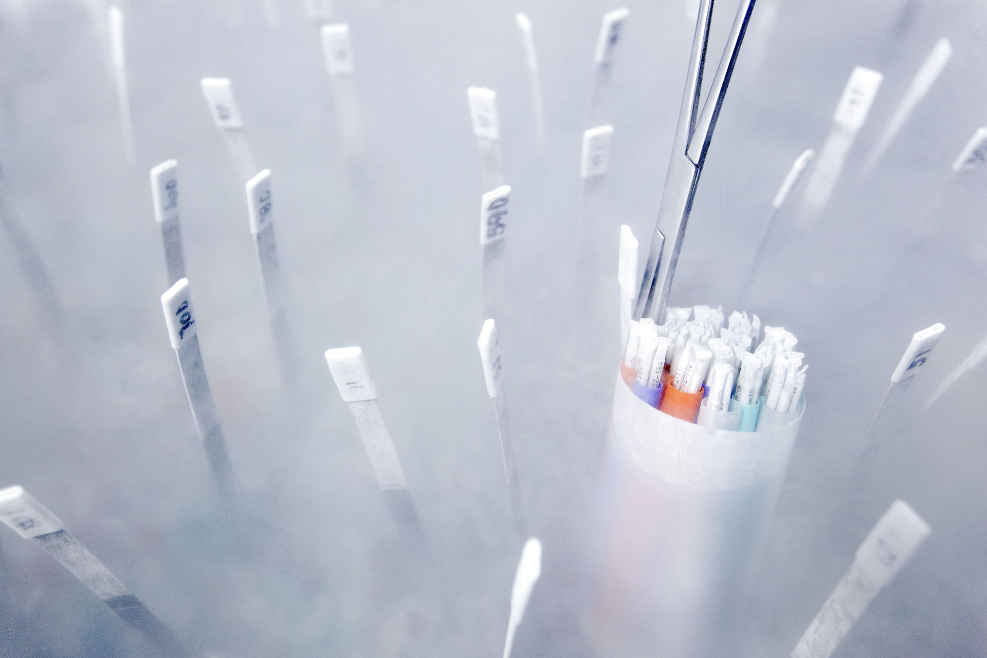 Hovedkontor og laboratorium for den internationale sædbank Cryos i Aarhus. Cryos - international sperm bank. Nedfrosne sæddonationer opbevares i store beholdere, hvor de holdes nedfrosne i flydende nitrogen.
