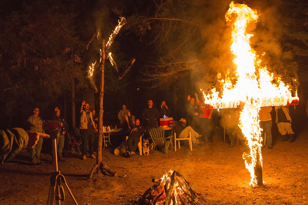 Members of the National Socialist Movement and the Adirondack Fraternity White Knights, a group that claims affiliation with the Ku Klux Klan, take part in a cross and swastika lighting ceremony at a private residence in Hunt County, Texas, November 9, 2014. The Ku Klux Klan, which had about 6 million members in the 1920s, now has some 2, 000 to 3, 000 members nationally in about 72 chapters, or klaverns, according to the Southern Poverty Law Center, an organization that monitors extremist groups. REUTERS/Johnny Milano PICTURE 30 OF 34 FOR WIDER IMAGE STORY "INSIDE THE KU KLUX KLAN" SEARCH "MILANO KKK" FOR ALL PICTURES