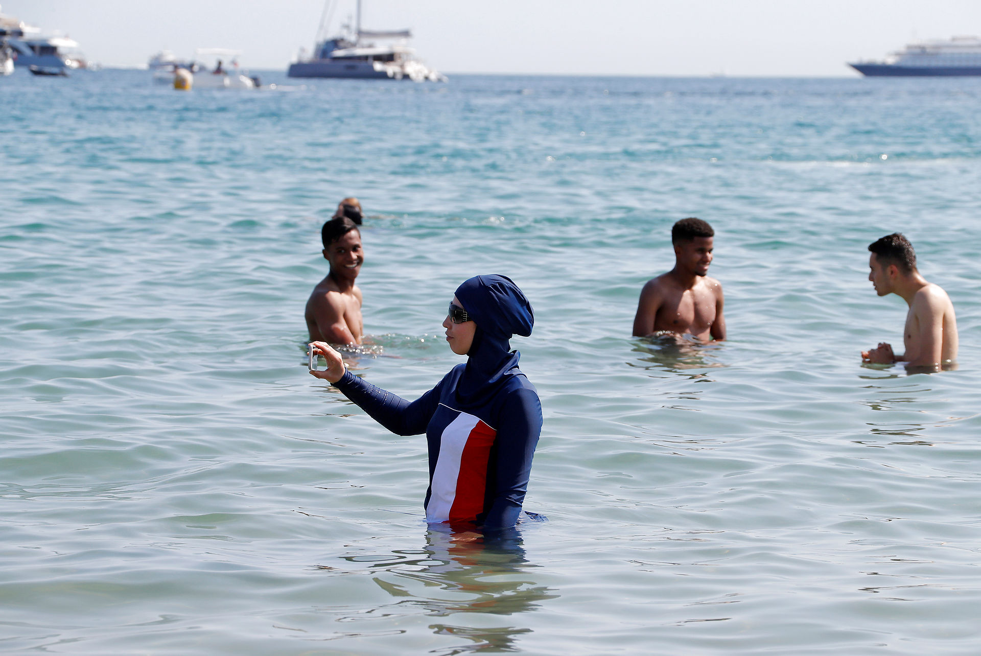 70th Cannes Film Festival - Cannes, France. 27/05/2017. Karima, wearing a full-body burkini swimsuit, takes a selfie on a beach in Cannes after the call to support the wearing of burkinis by businessman and political activist Rachid Nekkaz. REUTERS/Eric Gaillard