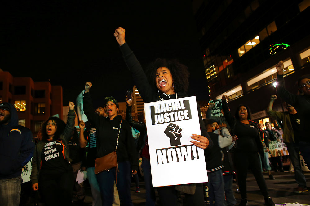 Demonstrators in the "Fight for $15" wage protest are joined by social justice and Black Lives Matter activists at a rally in downtown San Diego, California, U.S., November 29, 2016. REUTERS/Mike Blake