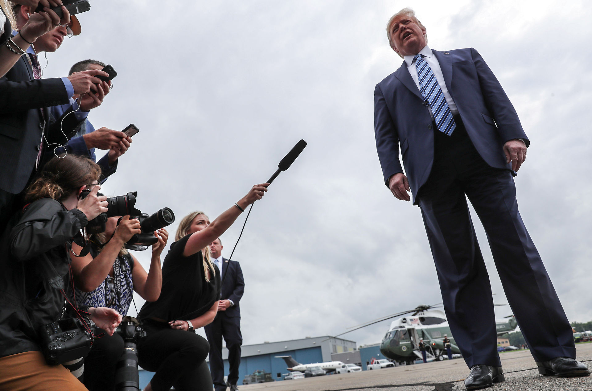 U.S. President Donald Trump talks to reporters as he boards Air Force One for travel to Pennsylvania from Morristown Municipal Airport in Morristown, New Jersey, U.S. August 13, 2019. REUTERS/Jonathan Ernst