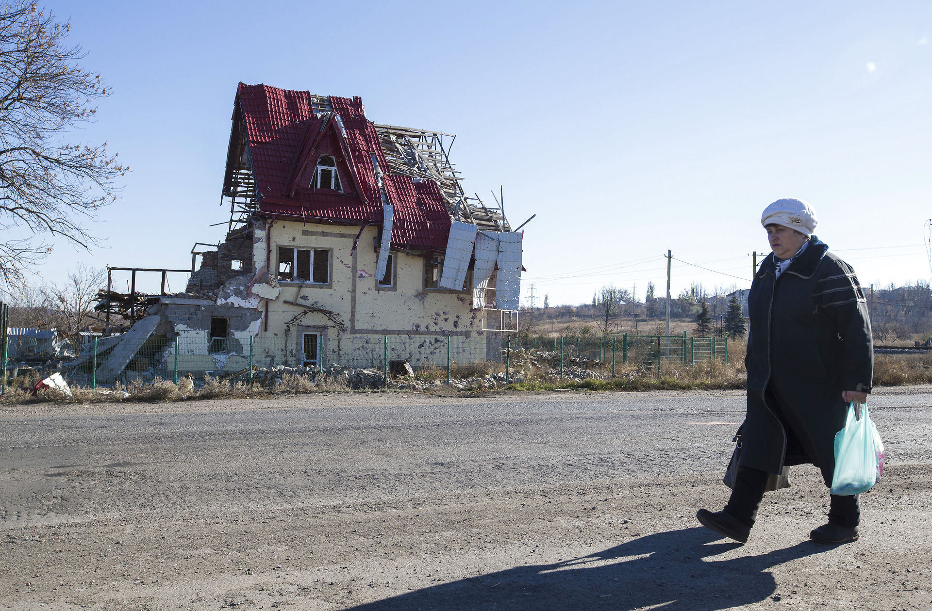 A woman walks near a house damaged by recent shelling in the village of Semyonovka near Slaviansk, eastern Ukraine, October 27, 2014. Pro-Europe parties secured a big win in an election in Ukraine, a partial vote count showed on Monday, with President Petro Poroshenko hailing people's support for his plan to end a separatist war and pursue democratic reforms sought by the West. REUTERS/Vasily Fedosenko (UKRAINE - Tags: CIVIL UNREST ELECTIONS POLITICS)