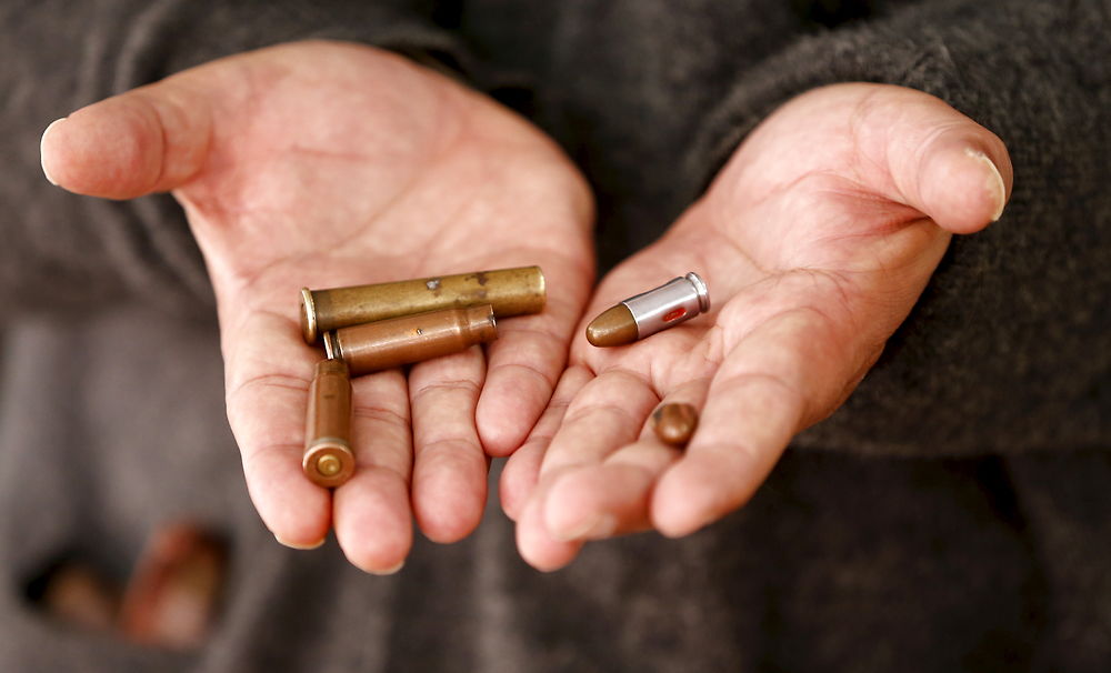 Shell casings, bullet fragments and a live bullet which misfired, items found at the scene of a school shooting, are displayed by Aurangzeb, father of Hassan Zeb at their home in Peshawar, Pakistan December 11, 2015. The family of Hassan Zeb have created a rooftop shrine for their son covered with pictures of the 134 students and 16 staff killed in the Taliban attack on the Army Public School in Peshawar. It has become a central gathering place for all the families. Picture taken December 11, 2015. REUTERS/Caren Firouz