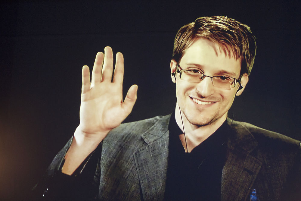 MOLDE 20150905. Edward Snowden tildeles Bjørnsonprisen 2015 på Kulturhuset Plassen i Molde lørdag formiddag. Her takker han for applausen han får etter å ha blitt intervjuet av Per Anders Johansen, journalist og Moskva-korrespondent i Aftenposten. Foto: Svein Ove Ekornesvåg / NTB scanpix