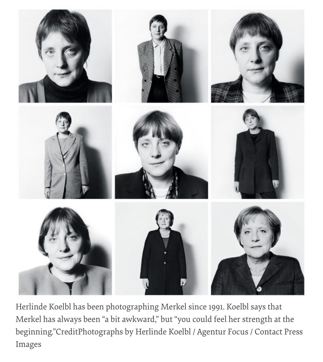 Angela Merkel har et skævt smil. Lidt venstredrejet og uudgrundeligt. Det kunne man se for nylig, da Donald Trump nægtede at trykke hendes hånd. Man kan også se det i en bemærkelsesværdig fotoserie, som hun har stået model til 26 år i træk. Fotografen Herlinde Koelbl har arbejdet på sit fotoprojekt Traces of Power siden 1991, og hans idé er at dokumentere, hvordan magt forandrer de mennesker, der har den. Måske kan det ses i deres ansigter. Angela Merkel holder sig til det skæve smil hele vejen igennem, fra rullekrave og Pixie-cut til jakkesæt. Hun har sgu kameratække.