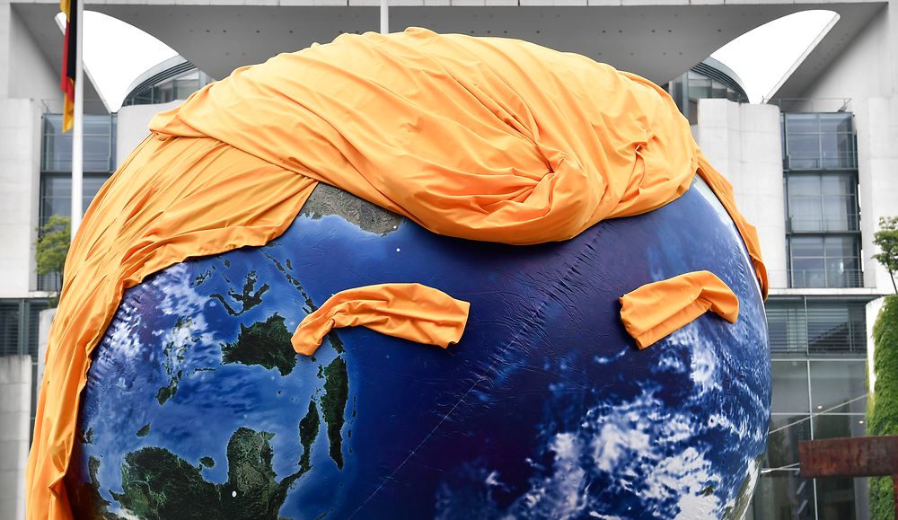 A giant balloon of the Earth with a haircut alluding to US President Donald Trump is placed in front of the Chancellery in Berlin during a protest on June 29, 2017. Activists called on German Chancellor Angela Merkel to "stand up to Trump by leading the 19 remaining countries to commit to a 100 percent clean energy future", prior to a meeting of Merkel with western European allies to draw up a battle strategy a week before she hosts a fractious G20 summit. Trump had decided earlier this month to pull the United States out of the 2015 Paris Agreement to combat climate change. / AFP PHOTO / John MACDOUGALL