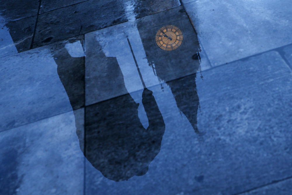 The statue of Britain's former Prime Minister Winston Churchill is reflected onto the rain covered pavement in front of the Houses of Parliament in London, January 30, 2015. Today marks the 50th anniversary of the funeral of Churchill, Britain's wartime leader. REUTERS/Eddie Keogh (BRITAIN - Tags: POLITICS ANNIVERSARY TPX IMAGES OF THE DAY)