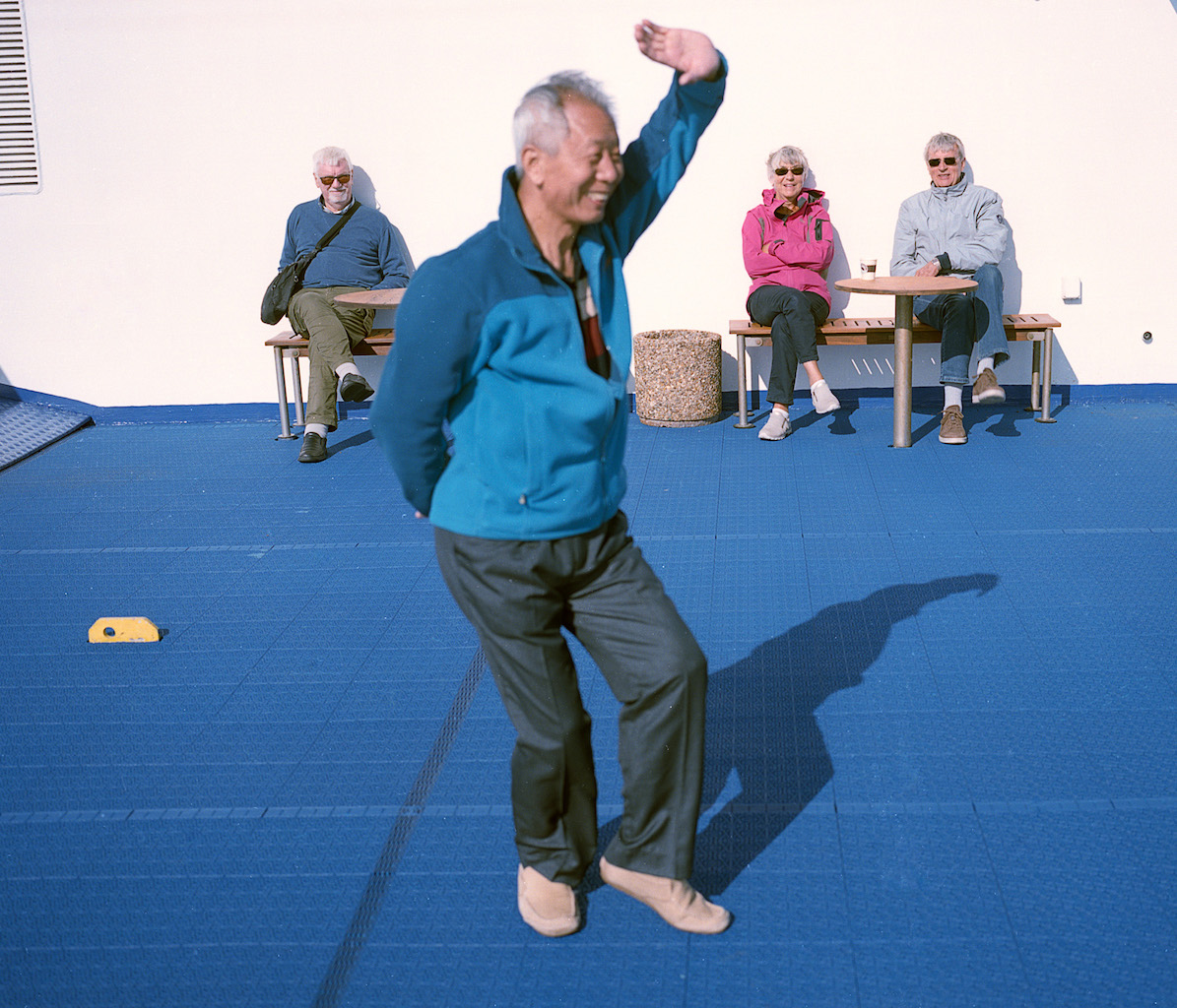 En kinesisk mand poserer på dækket for sine venner, der fotografer ham. Foto: David Williams