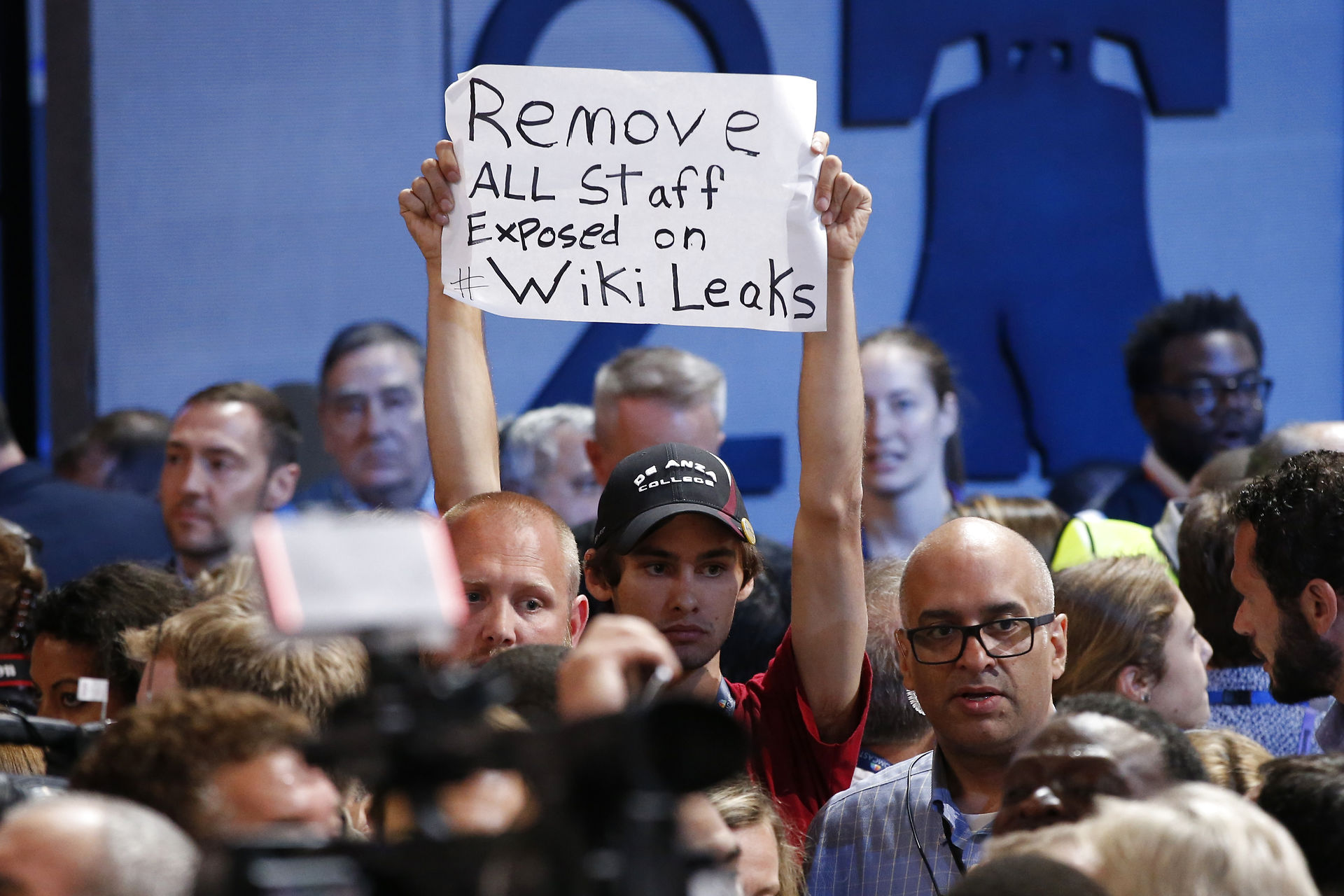 A delegate calls for removal of DNC staff involved in the Wikileaks scandal at the Democratic National Convention in Philadelphia, Pennsylvania, U.S. July 26, 2016. REUTERS/Lucy Nicholson