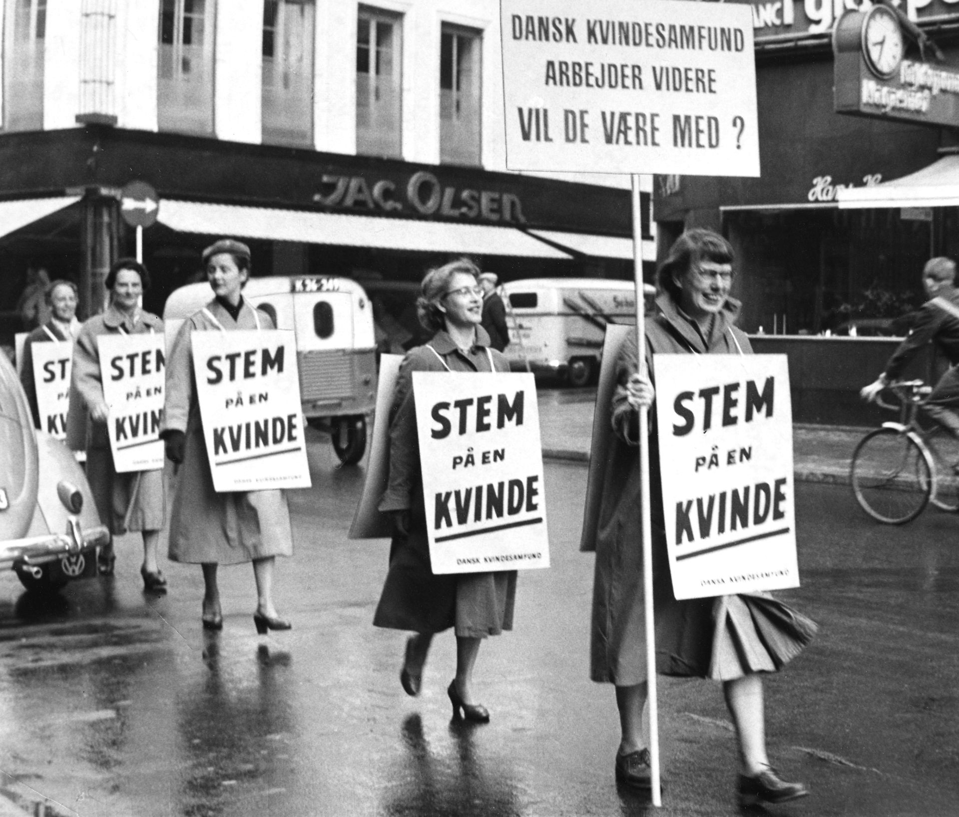 Dansk kvindesamfund demonstrerer. Her nogle kvinder som opfordrer til at stemme på en kvinde.