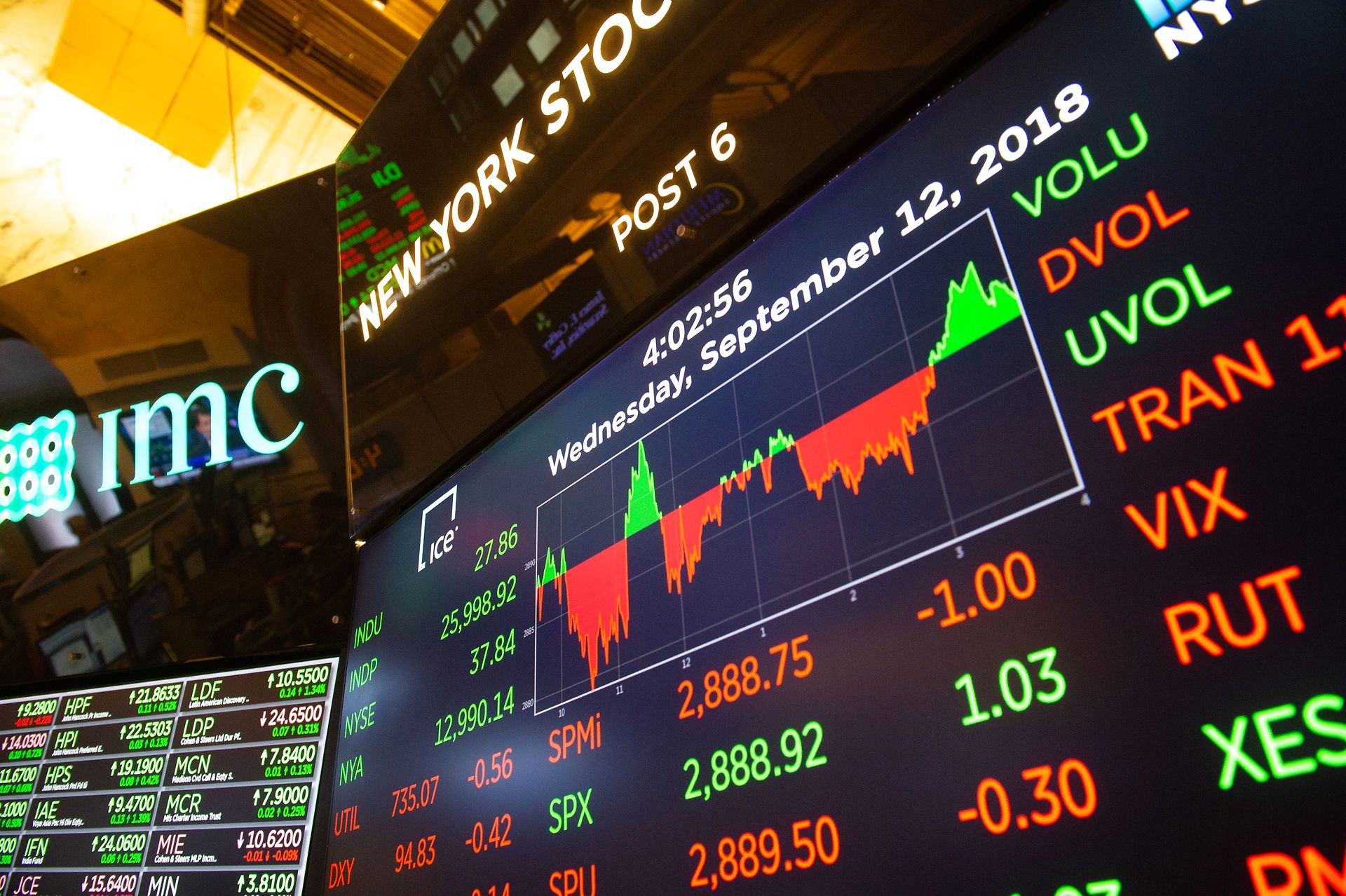 The closing numbers are displayed after the closing bell of the Dow Industrial Average at the New York Stock Exchange on September 12, 2018 in New York. - Wall Street stocks finished little changed on Wednesday following a volatile session amid lingering trade war anxiety, while Apple shares fell following its latest product launches. The Dow Jones Industrial Average inched up 0.1 percent to 25, 998.92. The broad-based S&P 500 added a hair at 2, 888.92, while the tech-rich Nasdaq Composite Index slipped 0.2 percent to 7, 954.23. (Photo by Bryan R. Smith / AFP)