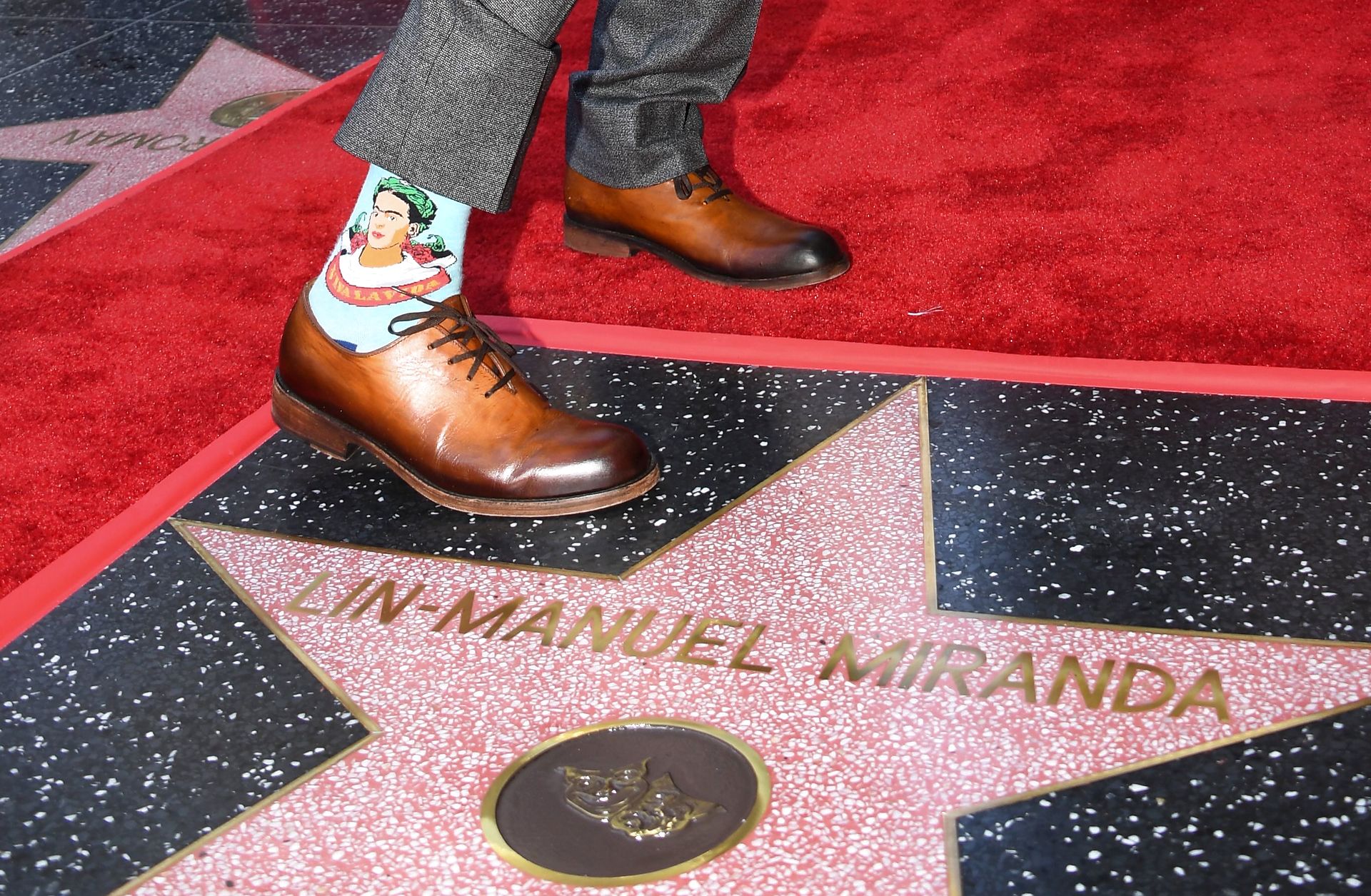 Hamilton creator Lin-Manuel Miranda shows off his Frida Kahlo socks as he celebrates getting his Star on the Hollywood Walk of Fame on November 30, 2013 in Hollywood, California. (Photo by Robyn Beck / AFP)