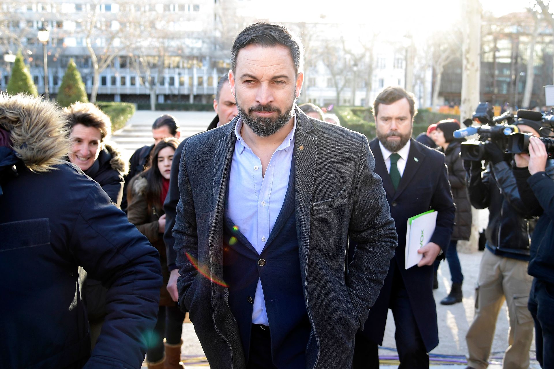 Spanish far-right Vox party leader Santiago Abascal arrives to attend the trial of jailed Catalan separatists at the Supreme Court in Madrid on February 12, 2019. - Twelve former Catalan leaders go on trial at Spain's Supreme Court for their role in a failed 2017 bid to break away from Spain. (Photo by JAVIER SORIANO / AFP)