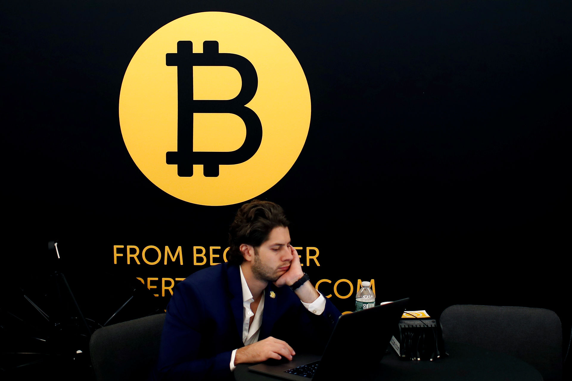 A man works on a laptop beneath the Bitcoin logo at the Consensus 2018 blockchain technology conference in New York City, New York, U.S., May 16, 2018. REUTERS/Mike Segar