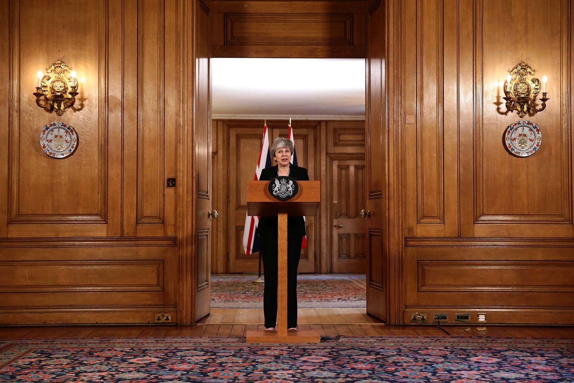 TOPSHOT - Britain's Prime Minister Theresa May gives a statement inside 10 Downing Street in London on April 2, 2019 after chairing a day-long meeting of the cabinet. - Britain will seek a further delay to Brexit to allow more time for parliament to pass the deal agreed with the European Union, Prime Minister Theresa May said today. (Photo by Jack Taylor / POOL / AFP)
