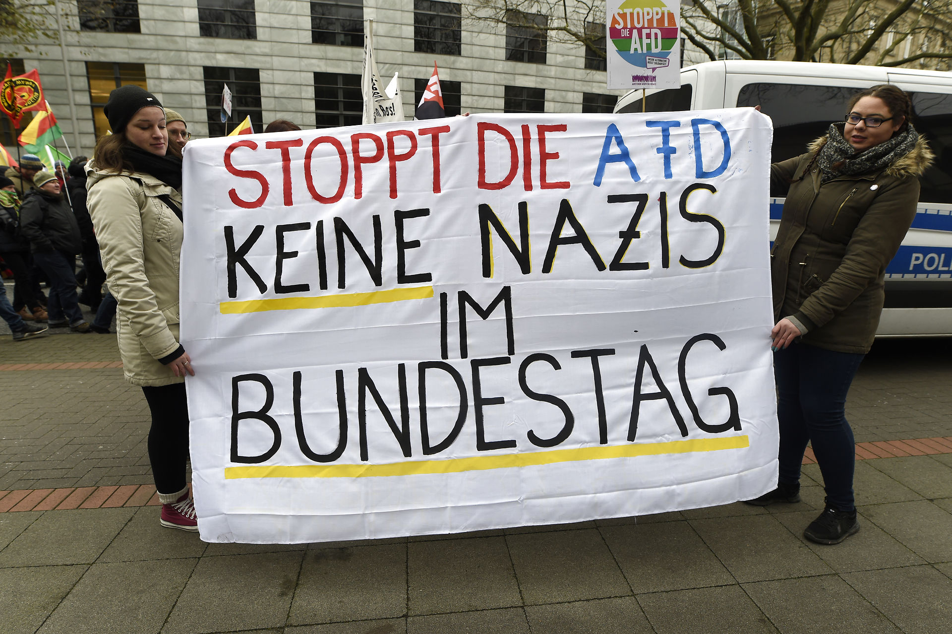 Protesters hold a banner during the congress of the anti-immigration party Alternative for Germany (AfD) in Hanover, Germany December 2, 2017. Sign reads "Stop the AfD.No Nazis in the German Parliament". Flere politifolk og mindst én demonstrant er kommet til skade under en demonstration lørdag mod det indvandringskritiske parti Alternative für Deutschland (AfD) i Hannover. Skriver Ritzau den 02. december 2017 . (Foto: FABIAN BIMMER/Scanpix 2017)