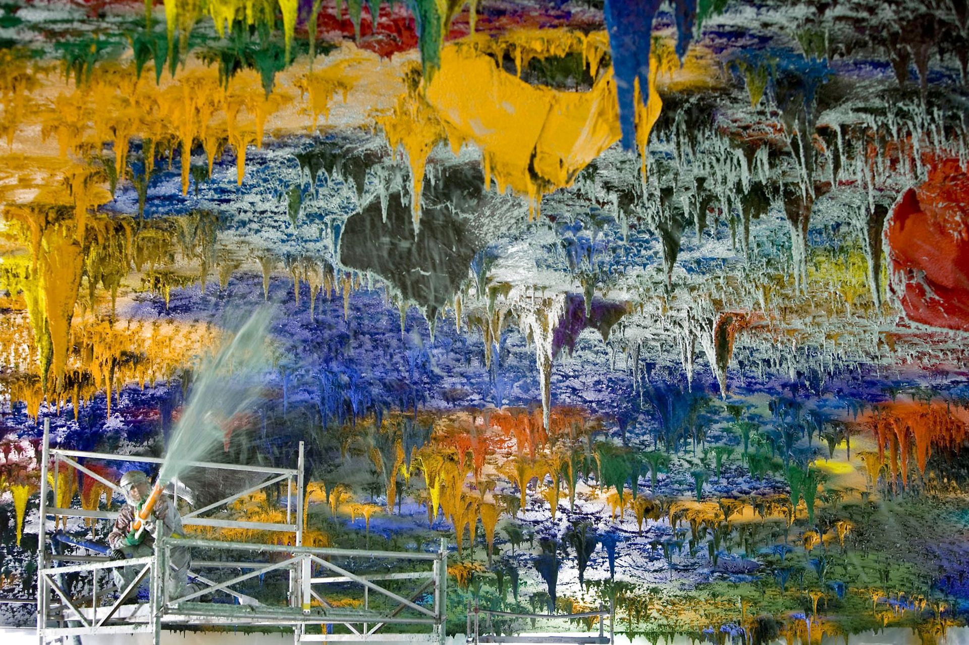 Spanish artist Miquel Barcelo works on his ceiling painting on the dome of Room XX at the European headquarters of the United Nations in Geneva in this undated handout photo. Barcelo was commissioned by Fundacion ONUART on the sixtieth anniversary of the Universal Decloration of Human Rights to undertake the most extensive work of art in the history of the United Nations at the venue for the Human Rights Council which will be inaugurated on November 18, 2008 by UN Secretary General Ban Ki-Moon. Barcelo used over one hundred tones of paint with pigments from all corners of the globe on the enormous 1500 metres squared dome. REUTERS/HO/ONUART-Agusti Torres (SWITZERLAND) MANDATORY CREDIT