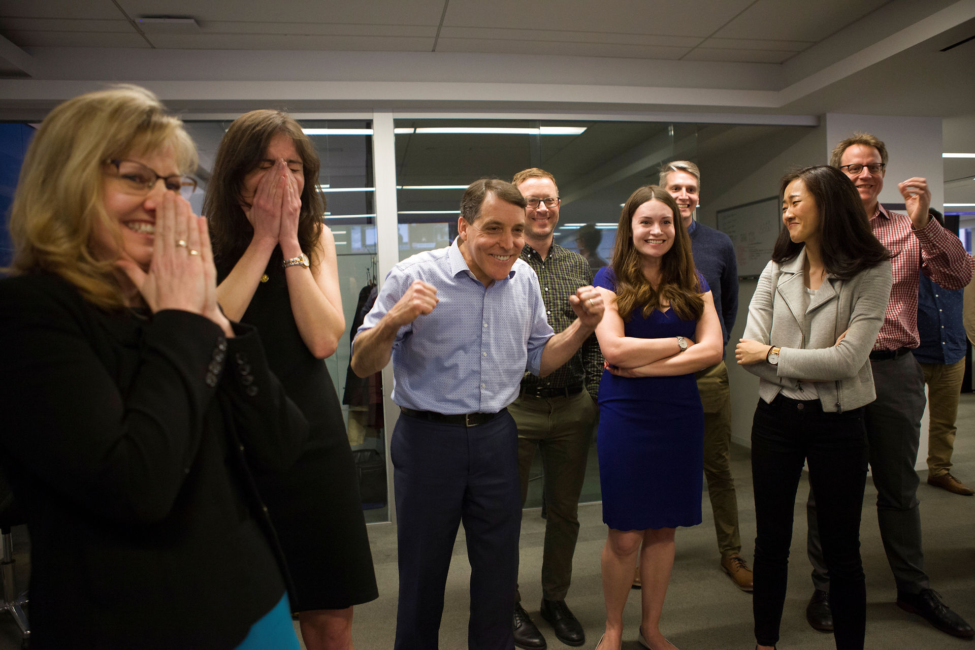 The Wall Street Journal staff celebrates the paper's Pulitzer Prize win for National Reporting, L-R: Jennifer Forsyth, Rebecca Davis O'Brien, Michael Siconolfi, Michael Rothfeld, Rebecca Ballhaus, Joe Palazzolo, Nicole Hong, Ashby Jones, in their newsroom in New York, U.S., April 15, 2019. Courtesy Stephanie Aaronson/The Wall Street Journal/Handout via REUTERS ATTENTION EDITORS - THIS IMAGE HAS BEEN SUPPLIED BY A THIRD PARTY.NO RESALES.NO ARCHIVES. MANDATORY CREDIT.