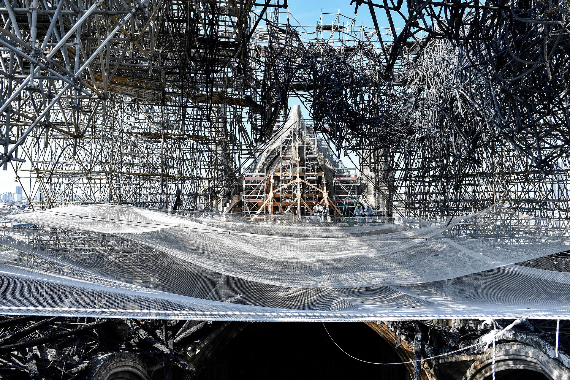 Parts of a destroyed rib vault and scaffolding are seen during preliminary work in the Notre-Dame Cathedral, three months after a major fire, in Paris, France July 17, 2019. Stephane de Sakutin/Pool via REUTERS. (Foto: POOL New/Ritzau Scanpix)