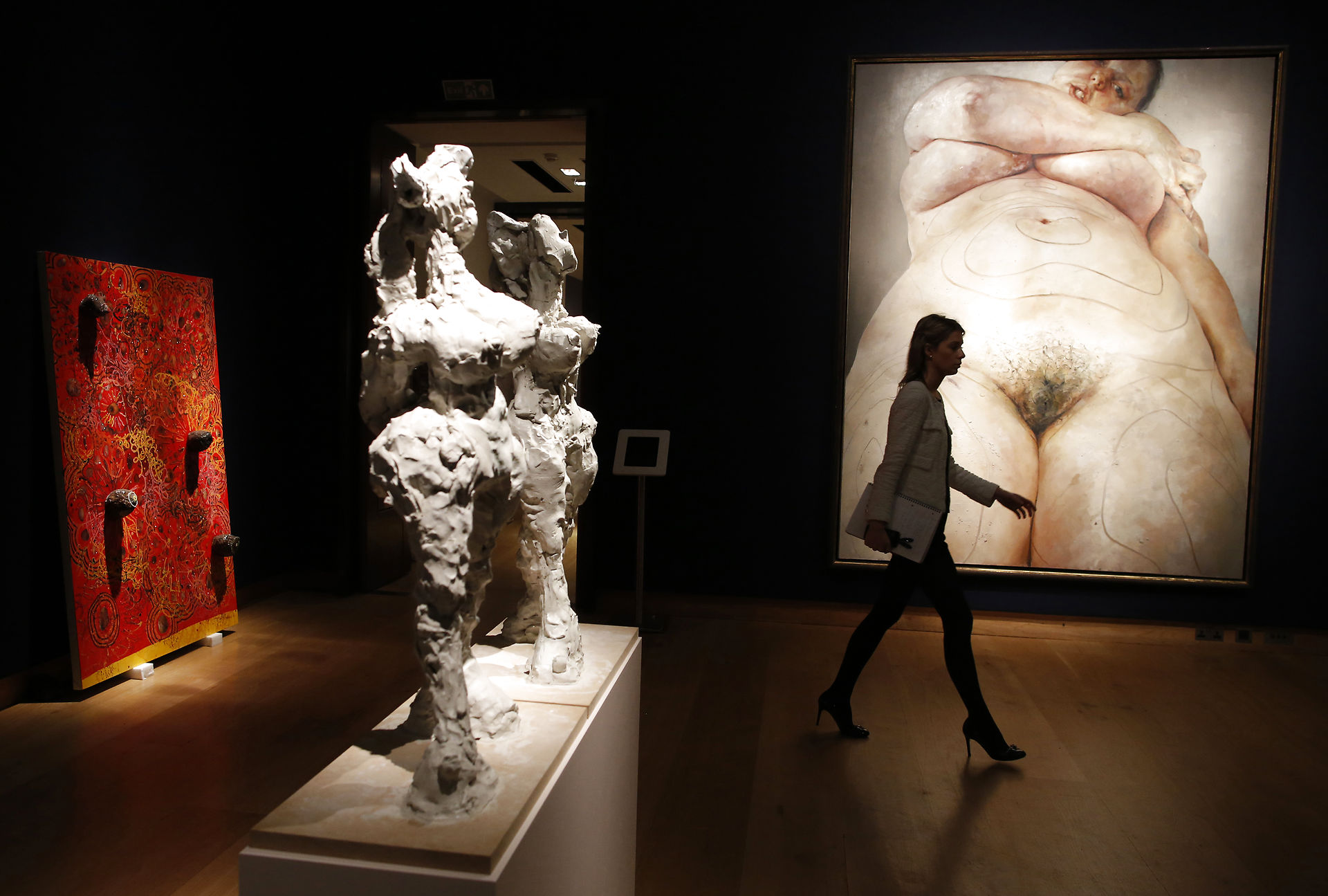 A woman walks past "Plan" by Jenny Saville on display at Christie's in London February 7, 2014. The painting is expected to earn 1.2 million GB pounds (1.9 million U.S. dollars) when it is auctioned in London on February 13, 2014. REUTERS/Olivia Harris (BRITAIN - Tags: SOCIETY) TEMPLATE OUT